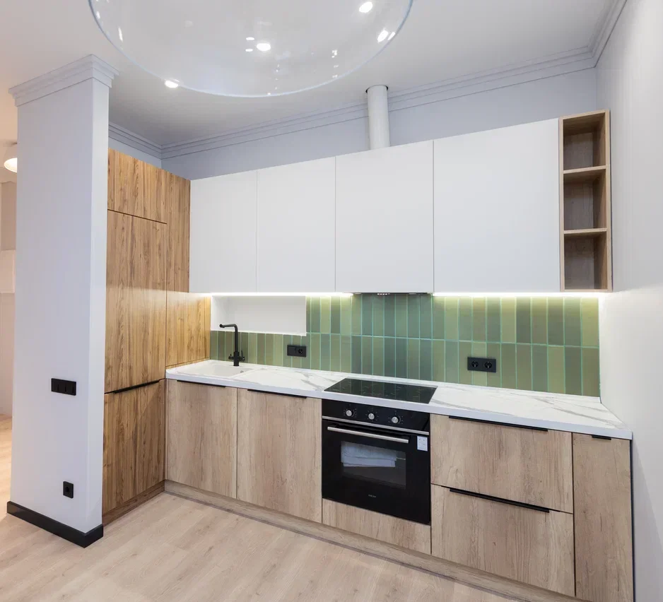 Отдельно делали гидроизоляцию в санузле и аккуратно выводили коммуникации для кухни — места мало, и важно было правильно расположить технику. Работы шли поэтапно, нас регулярно держали в курсе, присылали фото.